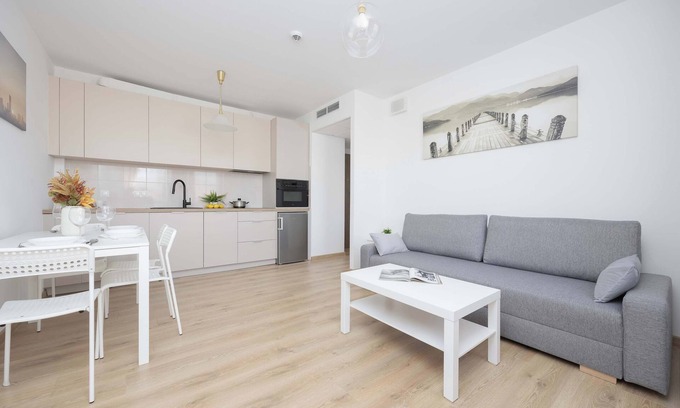 This modern building is located in a friendly and peaceful neighborhood full of greenery. The convenience of daily shopping is provided by the close proximity of a grocery store - you can walk to it in just 8 minutes. Motorized guests can use an outdoor parking space, and there are additional bicycle racks by the building. Lovers of greenery and relaxation by the water can visit the lake, which is about a 10-minute walk away. There is no shortage of public transportation stops nearby, making the place well connected to other parts of the city. This is a great area for parents traveling with children, groups of friends, couples and business travelers. A 13-minute walk is all it takes to reach the outdoor gym and organize an active outdoor recreation. It takes only 9-11 minutes to get to the airport and railway station by car, and about half an hour to the center of the capital. The route to the water park and tennis court takes about a quarter of an hour. Shopping enthusiasts can reach the shopping center Centrum Ursynów in 5 minutes. Meanwhile, with delicious meals and snacks, one can have a nice time at such eateries as Bezowy Zakątek or Chicago's Pizza, located a 10-11 minute walk away, or Zaścianek - Kuchnia za ścianą restaurant, located a 7-minute walk away.