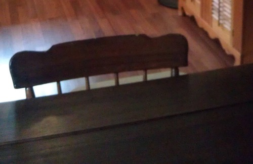 Past the den-library is the dining room featuring a Pennsylvania German log chinked pattern with Americana motif. Wide beam wood flooring with forged nails. Enjoy eating on an 1800's beautiful dark oak trestle table. The simple lighting is especially calming at night and gives you a sense of early pioneering appreciation, spiritualness, and forging ahead towards good times.