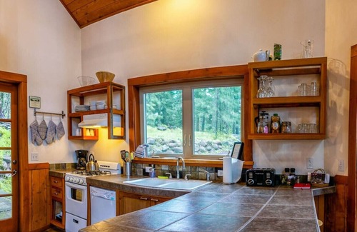 Pilot Rock Cabin comfortably sleeps six with a king bed on the main floor and one full bed and one full futon bed up in the loft. Meal-making is a snap with an easily accessible, fully stocked kitchen with all the modern amenities including a full oven, built-in microwave, refrigerator, dishwasher, coffeepot, and plenty of counterspace. The six-person table is perfect for dinner or game nights. The cozy wood-burning fire will get you nice and toasty for a deep sleep in the comfortable beds.