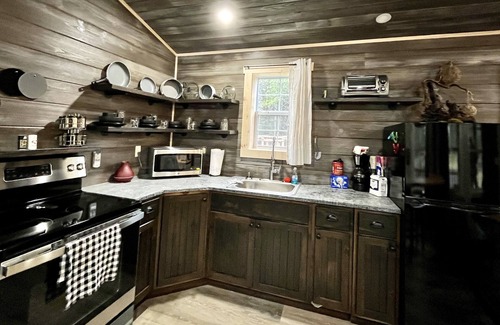 Cabin features private patio and dining area backed into its own personal wooded nook. The Firepit comes stocked with full-sized adult swings and 2 free bundles of firewood (more available to purchase on site)!! Cook your favorite meal in the full-size kitchen or outside over the fire and serve on our hand-crafted outdoor dining bar.