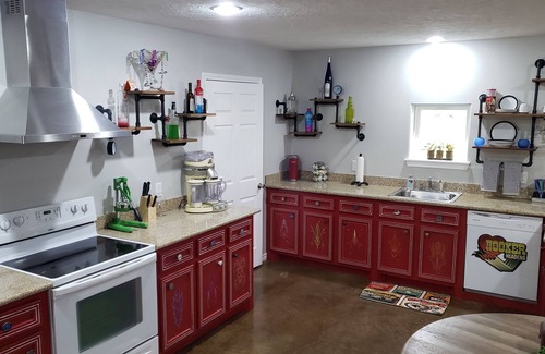Awesome Automotive Themed Barndominium. . This is a fully functioning private barndominium equipped with pinball machine, Double Diamond slot machine, shuffelboard, 8' Olhausen pool table, Vintage Arcade, vintage stand up Coca Cola Cooler, 65" Flatscreen TV, Margaritaville frozen drink machine, Margaritaville mixed cocktail machine, Jagermeister ice cold shot machine, and much more. This is a 1 bedroom master suite with master bath, the 2nd bathroom is located off the kitchen.