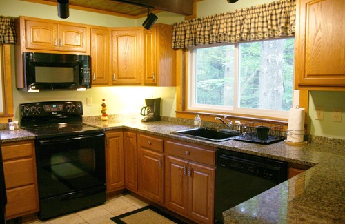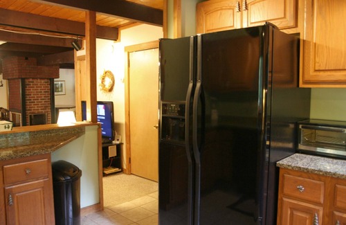 Main Floor: Enter from our front deck into the main living area. This level includes the kitchen (granite counters, fridge with filtered ice/water, convection oven, glass top stove, microwave, toaster over, blender, coffee maker, dishwasher, disposal), dining room (seats 16 + highchair), living room (42 inch flatscreen TV, DVR, DVD, stereo & phone with answering machine), central fireplace viewable from all 4 sides, king master bedroom, queen bedroom, twin bedroom, full bathroom & a large covered back deck with gas grill.