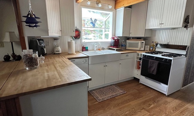 The 2-story cabin features a high ceiling living room where you can get cozy in front of a roaring fire and enjoy the big screen tv. The downstairs has 1 bedroom, 1 bathroom, a fully stocked kitchen with French doors opening out to the deck. The upstairs has an en-suite master bedroom and a den with a queen futon where you can play games and watch nostalgic VHS all time favorite videos. The den looks out through glass high ceiling windows where you can enjoy the falling snow during the winter. You can explore the woods down the steps to the backyard or take your sled down during winter months. Also enjoy a 1 minute walk to charming Green Valley Lake. Pet fee is a one time extra fee of 100 dollars. Extra guest one time fee of 60 dollars for each extra guest. Extra 50 dollar fee for early check in or late check out upon host approval.