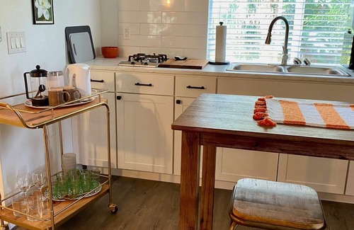 The interior boasts a queen size bed with luxury linens, cable tv, wifi, central heat/ac, large comfy sofa for relaxing and an arm chair for reading. Everything you need for your stay is provided in the fully equipped kitchen and bath.