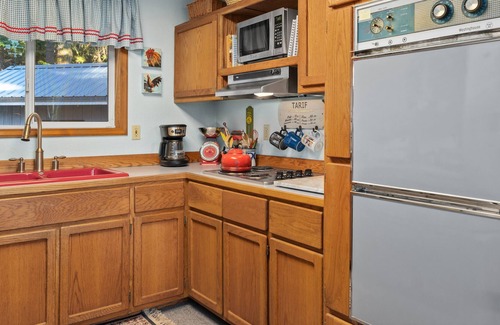 This modern and sunny 2br/1ba, saltbox-style cottage was built in 1990; a much newer build than other homes in the community. Pine Hill House has all the charm of quintessential, rustic, mountain cabins, yet all the comforts of sophisticated leisure lodging.