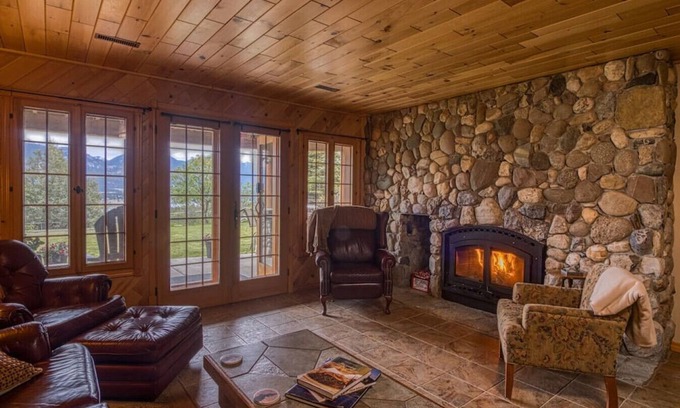 ✦ A warm, rustic gathering space with a river-rock fireplace, cozy seating, and forest views. Ideal for quiet evenings or morning coffee.