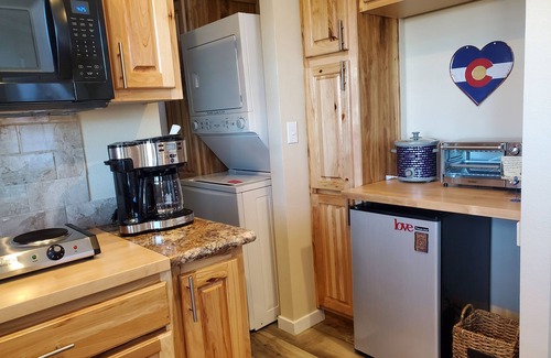 The kitchenette has 2 electric stovetop burners, a mini fridge, toaster oven, microwave, crockpot and coffee maker.