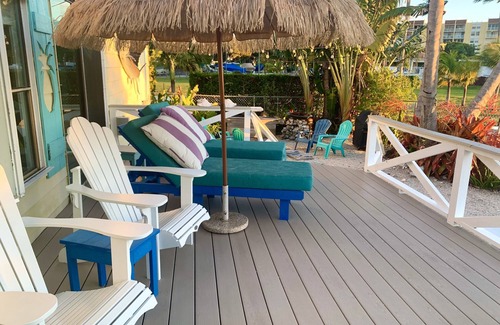 OUTSIDE/PORCH: The generous deck offers plenty of shade/sun seating and lounging. Enjoy your morning coffee under the covered porch in the comfy cushioned teak chairs. If you’re lucky you may spot a hummingbird buzzing around the flowers near the porch. (They’re usually here from November-April.) Catch some rays in the cushioned, adjustable poly-wood lounge chairs, or drift off to sleep in the hammock under the coconut palms. The fenced yard is perfect for relaxing with your pooch. The lush tropical landscaping is well maintained and includes coconut palms and many fruiting/flowering plants. There is also an outdoor seating area with speakers, cafe string lights, a stainless gas grill, stainless prep table, fish cleaning table, fire pit, and picnic table for outdoor dining. You will love showering island style in the private outdoor shower stocked with shampoo, conditioner, shower gel and clean towels. Sunset is the perfect time to hangout in the yard, enjoy the view, appreciate Mother Nature and the coastal creative touches Pineapple Point has to offer.