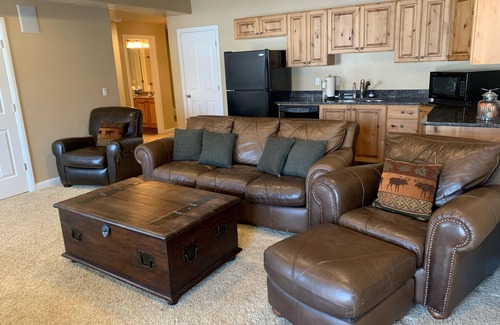 Brand new flat screen HD TV's with Netflix access above both gas fire places. Fully equipped kitchen upstairs, kitchenette with a second refrigerator, dishwasher and microwave downstairs. Washer, dryer and ironing board. WI-FI access and a private attached garage to store all your gear.