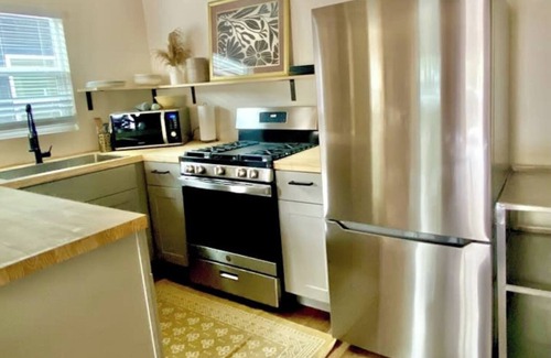 This charming Austin bungalow offers the perfect blend of comfort and convenience. Nestled in a vibrant neighborhood, you can step outside and stroll to your favorite coffee shops, lively bars, and delicious restaurants. The cozy living room welcomes you with warm cedar walls, comfy couch and vibrant textures. The well-appointed kitchen features modern appliances and ample counter space for your culinary adventures. Both bedrooms are spacious and bright, offering a peaceful retreat after a day