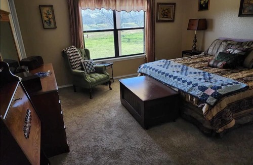 The main house features waterfront views of our 2-acre private pond, 3 bedrooms, 2 bathrooms, full kitchen, covered porches with grill, seating areas, and private 6-person hot tub. The main house can accommodate up to 8 guests and is equipped with Wi-Fi, TV, and AC. You also have access to a swimming pool that is shared with all of our guests.