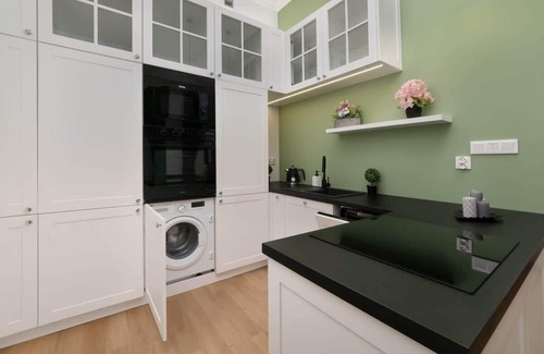 The elegant apartment is located on the second floor of the building and offers space for four people. It is an ideal option for families or groups traveling together. The interior is stylish and decorated in shades of green. The apartment consists of a living room with a kitchenette, a separate bedroom and a bathroom. In addition, there is a furnished balcony, where you can enjoy a cup of morning coffee and admire the most representative street in Lodz - Piotrkowska Street. Two beds are located in the bedroom on a double kingsize bed, and another two in the living room on a double sofa bed. You can prepare a delicious meal for the whole group using the induction hob available in the kitchenette, as well as an oven and microwave. Don't worry about washing dishes, as a dishwasher is also at guests' disposal. The designer bathroom features a bathtub, sink, mirror, towels and a special set of free toiletries. The apartment has access to all multimedia amenities, including a high-speed WiFi connection and a TV with SmartTV+ function. The apartment does not include a parking space. Guests traveling with pets are welcome - an additional fee applies.