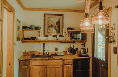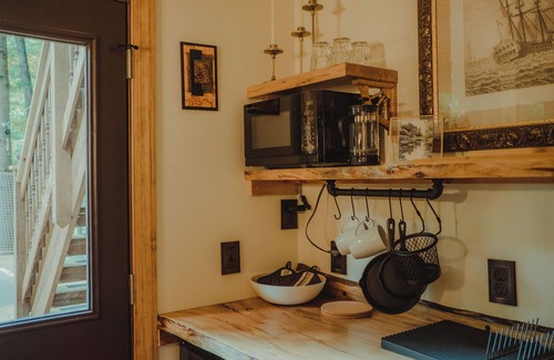 The Captain's Quarters contain the kitchen, full bathroom (with shower) and second queen bed. The entire site has pulled architectural inspirationfrom old wooden hand-hewn ships. Both the wood creations we've crafted and landscape really need to be seen in person to capture the magic of this place designed to help your imagination run wild! The lower hull of the Captain's Quarters is mounted to a massive boulder and includes a lounge net, front deck, and roof deck. Each unit includes heat, air conditioning, electricity, and full indoor plumbing. Sail away!
