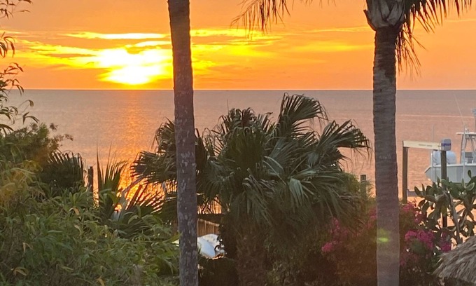 Gorgeous westward facing Gulf open views from the deck, dock and backyard with a stunning tropical backyard oasis!! Oversized private pool and tiki bar is perfect for the big kids, little ones will enjoy the sandy play area with Gulf view for the little ones!! All this leads you to an oversized dock for launching your kayaks, fishing, watching the manatee/dolphins and watching gorgeous sunsets directly ON the Gulf of Mexico. Properties like this are very rare!! No open water overnight docking BUT we will be offering alternative deep water docking options across the street in a protected canal. Ask us for details before bringing your boat so we can make arrangements for your vessel. No lifts available- approved wet slip only.