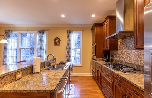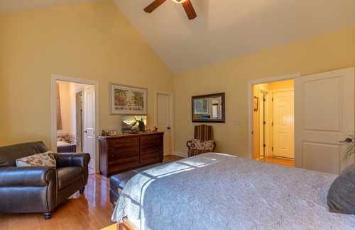 Tastefully designed and decorated, this is the perfect fit for a small family or group of friends looking to unwind. The main level offers a spacious gathering area with hardwood floors, vaulted ceilings, and leather couches arranged around a gas fireplace with TV mounted above. The dining table seats 6 in the formal dining room and there's another table for 4 near the kitchen. The kitchen is nicely updated with granite counters, stainless appliances and vent hood, and a tiled backsplash. Down the hall is a half bath, laundry room, and a Queen suite with a TV and private bath with tiled shower and jetted bathtub.