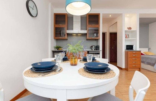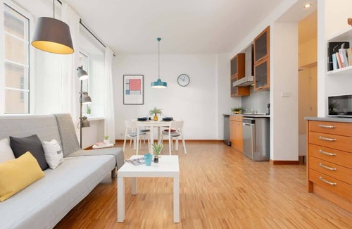 This fully equipped studio for 4 people has been designed to create a homely and welcoming atmosphere in a great location in Warsaw. It is the perfect choice for a stay in the centre of the capital with family or friends. The space is divided into a studio with a kitchenette and a bathroom with a shower. There is a comfortable double bed and a sofa bed. The studio is bright and functionally furnished to make your stay as comfortable as possible. The unique aura of the apartment is complemented by an attractive interior colour scheme with stylish decorative elements. The apartment is steeped in the historic atmosphere of the capital: its windows overlook charming townhouses. At the same time, the studio is equipped with modern conveniences such as free Wi-Fi access and a cable Tv. The kitchen area has a table and chairs for sharing meals. The apartment is fully equipped with all the necessary kitchen utensils and appliances (coffee maker, microwave, dishwasher) and bathroom amenities (washing machine, hairdryer) to ensure a comfortable stay. To facilitate the start of each night's stay, toiletries (soap, shampoo and shower gel), towels and bed linen are provided free of charge. The location of the apartment will certainly allow you to feel the atmosphere of the city among the main attractions of the capital. These advantages make the apartment an ideal choice for a carefree stay in Warsaw.