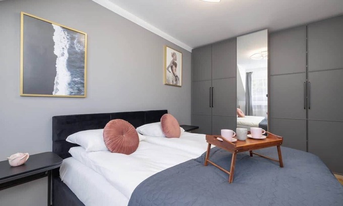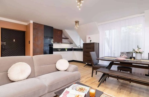 Elegant, two-bedroom apartment located on the 2nd floor guarantees comfortable accommodation for four people. This beautifully decorated condo with an area of 64 m² is a great choice for a leisure stay in Krakow for a group of friends or family. It accommodates two spacious bedrooms with comfortable double beds, a living room with a sofa bed combined with a well-equipped kitchenette and a bathroom with a bathtub and shower. The apartment also includes an intimate balcony with a seating area where you can enjoy a cup of morning coffee in peace. The high-end decor, stylish furnishings and careful finishing of the apartment are sure to delight even the most demanding guests. Tasteful accessories and decorations emphasize the unusual atmosphere of this place. Air conditioning installed in the interior will ensure a pleasant temperature regardless of the weather outside. The desk with an office chair, located in the apartment, will allow guests working remotely to perform their duties comfortably. Equipment in the form of high-quality kitchen appliances (dishwasher, microwave, kettle) and bathroom appliances (washing machine, dryer) will provide travelers with the utmost comfort. Multimedia in this apartment includes two flat-screen TVs and free Wi-Fi. A complimentary set of toiletries, as well as towels and linens are provided for a good start to the stay. Guests traveling by car can use the private garage.