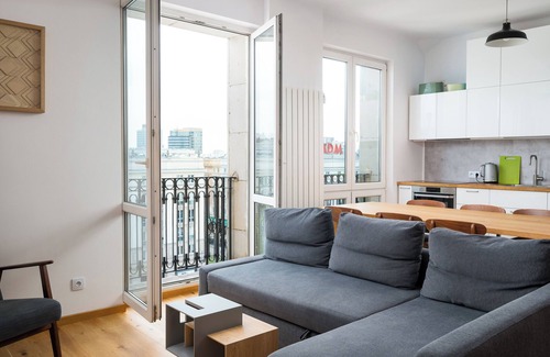 Plac Konstytucji Deluxe Apartment is an incredibly stylishly decorated apartment that can accommodate up to 6 guests! It features a cozy living room with a sofa bed and kitchenette, two separate bedrooms with comfortable double beds, and a bathroom. Guests have access to a range of practical amenities, including free WiFi, a television, a washing machine, an iron, a hairdryer, a refrigerator with a freezer, an induction cooker, a dishwasher, an oven, a kettle, and kitchen accessories.