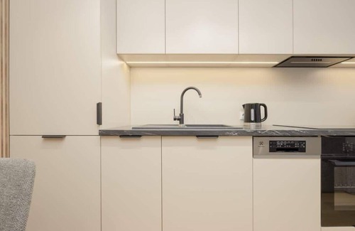 This exclusive yet cozy apartment is designed for six people and has two bedrooms to offer guests. The area of the premises has been effectively developed with attention to aesthetics and comfort of the space. Visitors can pleasantly spend their leisure time here during leisure and business trips. The apartment is located on the second floor of a building equipped with an elevator. There are cable television and two televisions available to visitors here - one has been placed in the bedroom with a double bed, while the other is located in the living room. The unit has a furnished balcony, where you can relax during a break from activity, drink your morning coffee or have a snack outdoors in a pleasant atmosphere. One of the bedrooms is furnished with a large double bed, a closet, a desk and a chair, while the other features a double sofa bed, a closet, a mirror, a chair and a table. The living room is equipped with a sofa bed and a dining table with chairs. The possibility of conveniently preparing meals is taken care of by a practically furnished kitchenette - here guests can take advantage of an oven, a refrigerator with a freezer, a microwave, as well as a pour-over coffee maker. A shower, washing machine, hairdryer and toiletries are available in the bathroom. The decor is in subtle shades of beige, making the interior look stylish and elegant.