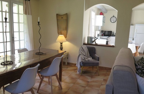 Charming villa with wooded garden, private 9x5 m pool and 6 beddings. Ground floor: entrance hall, toilet, 33 m² living room with television and double sofa-bed, fitted kitchen (hob, oven, dishwasher, washing machine and refrigerator), cellar, garage, covered terrace, patio, barbecue and garden furniture. First floor: 2 bedrooms (one with double bed and one with 2 single beds), bathroom and toilet. The house is located in a quiet district, 0.5 km from Apt and 100 m from a cycle path.