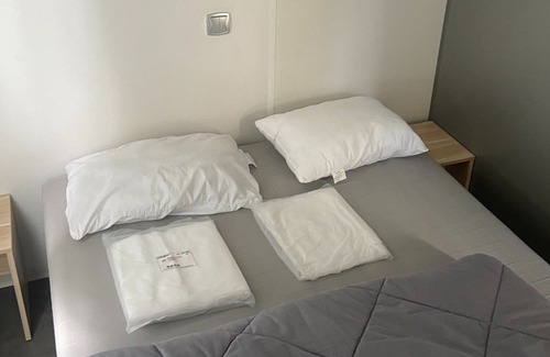 This air-conditioned mobile home with a surface area of 36 m2 has 2 bedrooms (1 master bedroom and 2 bedrooms with 2 single beds) and 1 bathroom.