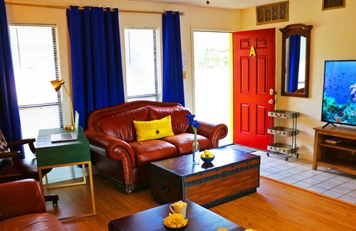 Suite A is on the ground floor and is handicap accessible. Perfectly located! Minutes from downtown Austin and from the airport. Shaded by three MASSIVE pecan trees, Pecan Place At Manor is your stylish, inviting, home away from home. Easy walking distance to lots of restaurants, parks (bocce!) even a small-town pool hall and of course Texas BBQ.