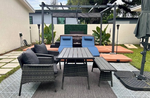 This modern house has all the fixings for a fully comfortable stay offering 2 bedrooms with an open plush contemporary design & outdoor yard deck & jacuzzi spa. The space provides tasteful, adaptable decor & furnishings that create a serene, safe, & recreational setting. All the while conveniently located 5-7 mins to MIA Airport, Wynwood, Midtown & Design District. It’s also 10-15 min. ride to Downtown, Brickell, & Miami Beach. Perfect space for traveling individuals, nomads, remote workers, small group/families.
