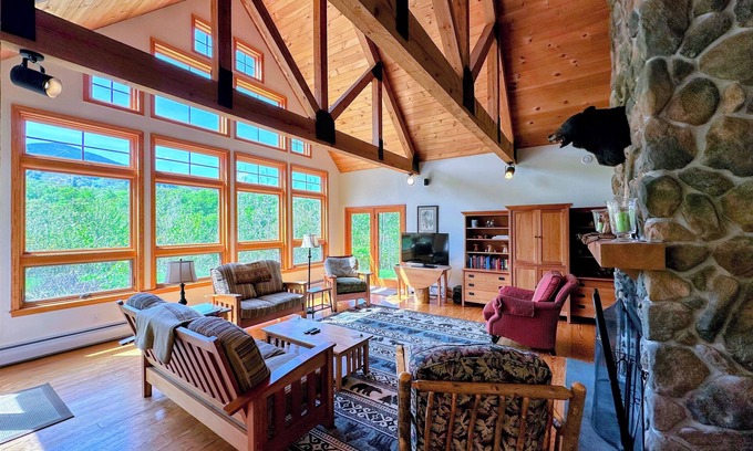 Dining/Living Area: A sunny open concept space with large rustic dining table that seats 6 and comfortable furniture that surrounds the grand stone wood burning fireplace. Views of the Cannon Mountain ski slopes from every window and access to the back yard and patio.