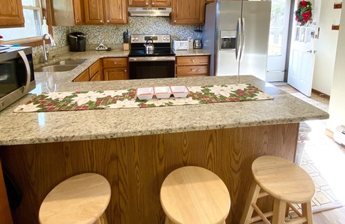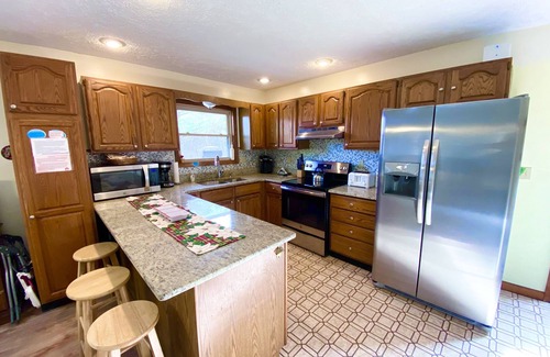 3 levels of living spaces consist of 5 bedrooms and 3 baths (one of the bath has spa tub) with beds for up to 14 guests plus infants. Two separate living areas plus sunroom to give your group the space to spread out. Living room has smart TV, and family room has large screen projector that is great for watching movie or playing video games. Master bedroom has King size bed, smart TV, and private bath. There also a private balcony with table and chairs to enjoy your morning coffee. This will be your romantic retreat and as well as family getaway. Besides large screen projector TV, family room also has pool table w pingpong top, Xbox, Apple TV, foosball table, movie/book library, poker set and board games. Kitchen is fully stocked to cook and serve for a larger group, and it has coffee maker, toasters, blender, mixer, popcorn maker, waffle maker, and bakeware.