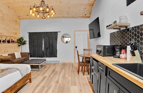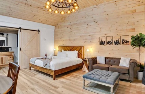 Have a relaxing stay in this charming cabin themed unit with modern amenities and tasteful décor, perfect to nestle up in on a snowy day as you watch the flakes fall gentle onto the pine trees around you.