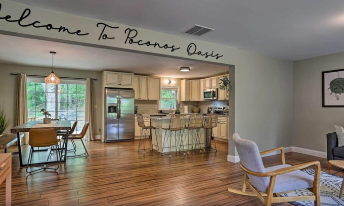 Poconos Oasis with hot tub, Game RM, & Fire pit 8 min from Bushkill & Shawnee has 4 Bedrooms , 3 Bathrooms, and max occupancy of 12 people. The minimum rental for this property is 1 nights, but this can change depending on the season you plan on staying. Previous guests have given good rated it, and VRBO labeled it a top-rated House because of the excellent services rendered by the owner or manager of this House, and has consistently provided great experiences for their guests. Most families or guests that use it recommend it to their friends and some of them are repeat guests. House has a friendly neighborhood, and the East Stroudsburg has interesting places to visit. If you want to learn more about the House in East Stroudsburg, such as places to visit and things to do nearby, you can check below to learn more.