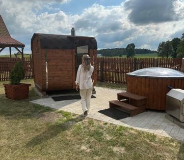 Providing a garden, Pod skrzydłami provides accommodations in Miłomłyn. This beachfront property offers access to a patio and free private parking. The villa features an outdoor fireplace and a 24-hour front desk. Featuring a terrace and lake views, the villa includes 5 bedrooms, a living room, flat-screen TV, an equipped kitchen, and 2 bathrooms with a walk-in shower. Guests can take in the ambience of the surroundings from an outdoor dining area or keep warm by the fireplace on colder days. For added privacy, the accommodation features a private entrance. You can play table tennis at the villa. A bicycle rental service, a private beach area, and water sports facilities are all available at Pod skrzydłami, and guests can go fishing in the surrounding area. Elbląg Railway Station is 31 miles from the accommodation, while Stadium Ostroda is 12 miles from the property. Olsztyn-Mazury Airport is 68 miles away.