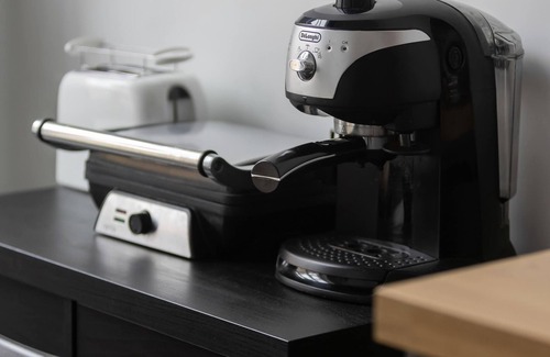 Induction hob, oven, refrigerator with freezer, electric kettle, coffee maker (pressure), toaster, electric grill, dishwasher, set of dishes, kitchen utensils, table with chairs