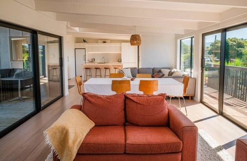 Welcome to our cosy retreat! Our property features an open-plan dining area with a well-equipped kitchen, perfect for shared meals. The comfortable lounge offers large sliding doors with garden access on one side and a balcony with sea views on the other. In total, we have three bedrooms: Bedroom 1 has a King and a single bed with balcony access, Bedroom 2 features a bunk bed and a Queen bed, and Bedroom 3 offers a King bed and a bunk bed.