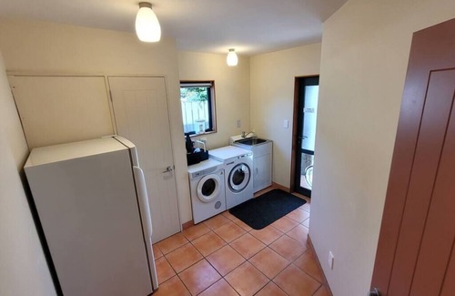 For added convenience, a well-equipped laundry room awaits, equipped with a washing machine and dryer, making light work of any sandy beach towels or adventurous hiking gear.