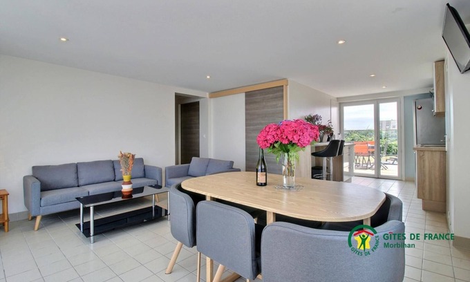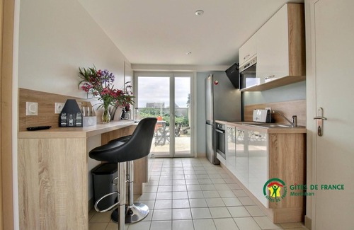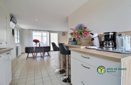 The gîte is on the ground floor of the house. It looks like this: Equipped kitchen open to the living room/living room. Shower room with wc. Two bedrooms, the first with a 160x200 electric bed, the second with a 160x200 bed and a 90x190 bed. Outside, you can enjoy a terrace and a 161m² garden with dining table, barbecue and deckchairs. The floor of the house is occupied by the cottage 56G5215. In common: the car park. Rental accessible to people with reduced mobility. On request, loan of a wheelchair. The owners offer you the rental of bicycles, sea kayaks and an AMPARES 580 HB boat for the day or half a day, contact them for more information. In the Regional Natural Park of the Gulf of Morbihan, Damgan is a popular seaside resort with its coastal landscapes and its spit of sand nearly 5km long. The town retains today a certain charm that does not leave anyone indifferent with its panorama, its benches at the water's edge which allow you to admire the Pénerf river, the slight swaying of the boats in the port located 800m away, its restaurants and its chapel. Take the time to ask yourself, to contemplate "the glitter" on the water and the passage of boats. Admit it makes you want?