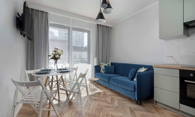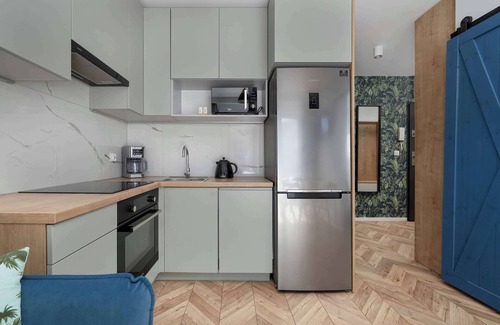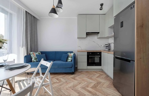 The apartment captivates with its modern style, brightness, and harmonious colors. Elegant finishes combine with functionality, creating a space where you can feel at home while enjoying complete comfort. The living room is the heart of the apartment – cozy yet elegant. The focal point is a comfortable, fold-out sofa, which can serve as an additional sleeping space or an ideal place for afternoon relaxation. Guests have access to internet television and a Smart TV, allowing for both shared movie nights and access to their favorite streaming apps. The living room's ambiance is complemented by modern accessories and thoughtful lighting, creating a warm and homely atmosphere. The lounge area opens onto a charming balcony with garden furniture, perfect for morning coffee, a romantic dinner, or a moment of respite after a busy day. The kitchenette was designed with complete comfort and freedom in mind when preparing meals. It's equipped with an induction cooktop, oven, dishwasher, drip coffee maker, refrigerator with freezer, microwave, and a full set of dishes and kitchen utensils, allowing you to prepare everything from a quick breakfast to a full, home-cooked dinner. The bedroom impresses with its spaciousness and functionality. A comfortable bed with soft bedding and subtle accents create an atmosphere conducive to regeneration and relaxation, allowing for true rest. The bathroom has been designed with attention to every detail. Elegant finishes and modern fixtures enhance its character, while a spacious shower, toiletries, and fresh towels guarantee comfort and convenience in everyday use.