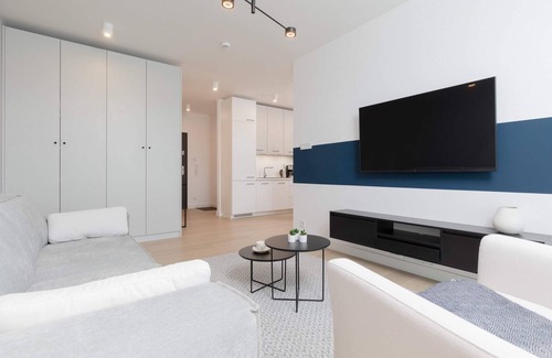 This fully equipped apartment with a balcony of 49 m² with accommodation for up to 4 people is a convenient solution for a family vacation or a trip with friends! The living area consists of a living room with a kitchenette, a bedroom, a bathroom with a shower and a hallway and a dressing room. The modern decorated space in gray and white, with a touch of navy blue, creates an elegant atmosphere, and the wooden floors add warmth to the interior. The property is comprehensively equipped: free Wifi connection and TV, kitchen and bathroom appliances. In addition, the apartment comes with a private furnished balcony, where you can relax and enjoy a tasty coffee in the fresh air on a summer morning. Guests can use an assigned parking space in the underground garage.