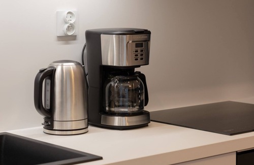 Induction cooktop, refrigerator with freezer, oven, electric kettle, coffee maker (pour-over), dishwasher, sink, glass stemware, set of dishes, cutlery, frying pan, table with 4 chairs