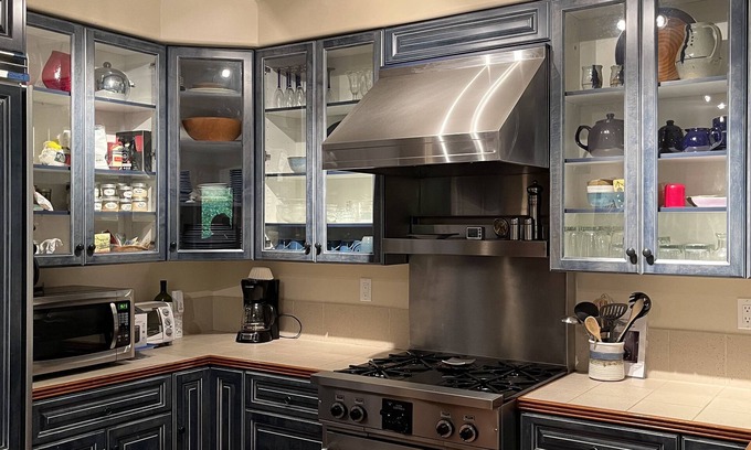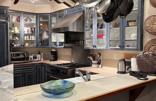 Enjoy cooking? The gourmet kitchen with its blue cabinetry and Mexican tile floor is well equipped and features a Garland stove and new Bosch fridge.