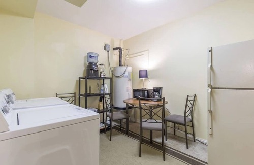 coffee maker and is equipped with beautiful stainless steel appliances,
