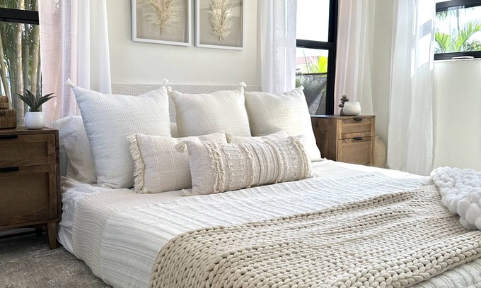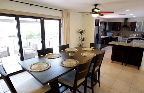 The inside is fully renovated with all new furniture, bedding, couches, tv's, etc. The master suite with a king bed and its own bathroom also offers an extra room attached that can be used as a fourth bedroom if needed or a private tv room. It also has a slider that has direct access to the patio and pool area.