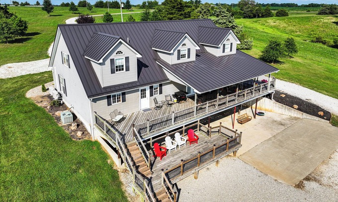 Escape to this charming 4-bedroom, 3.5-bathroom vacation rental house in Versailles, MO! Enjoy a private pond, 2 large decks, a fire pit, and a covered patio with swings. Inside, unwind with a ping-pong or foosball match, cozy up by the electric fireplace, or gather around the dining table. Just a short drive to the Lake of the Ozarks, Jacob’s Cave, and local wineries, this retreat blends relaxation with adventure!