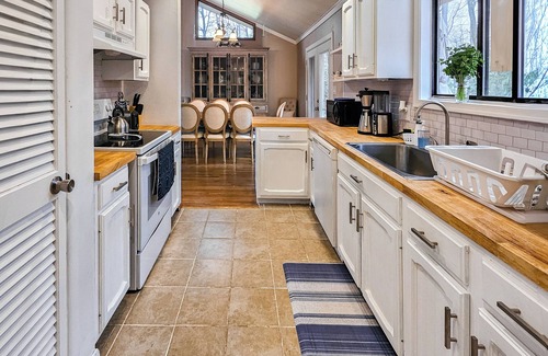 This 4-bedroom, 3-bathroom home features everything you need for your group getaway, from spacious interiors to ample amenities. Pond Place features an inviting atmosphere that sets the scene for quality time and cherished memories with your group. The living area boasts a large flat-screen TV and a brick fireplace for a cozy touch. Prepare your favorite home-cooked meals in the fully equipped kitchen, and eat around the dining table which seats 8.