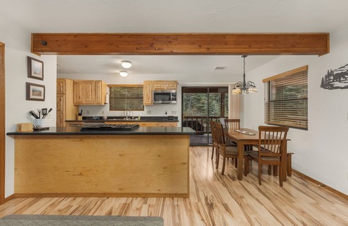 This spectacular 3-bedroom, 2-bath home sits on a large lot and has a deck right next to Grimes Creek. The decks overlook the creek on one side, and a large pond on the other side. Downstairs offers a large master bedroom with a King size bed, master bathroom with jetted tub and a separate shower, and a large walk-in closet. The second bedroom has a Queen size bed & connects to the second bathroom which has a tub/shower combination. The living room has a fireplace and a large flat-screen TV with DirecTV satellite. The kitchen is open to the living room and has a large commercial refrigerator, wine fridge, dishwasher, microwave, and a connecting laundry area. The upstairs has two twin beds and a sitting area with a desk. Large decks overlooking the water with a sitting area and a Bar-B-Que grill. Pets are not allowed in this vacation home. Approx. 2,500 sq. ft.