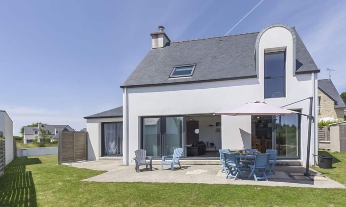 Plouharnel 4 km from Carnac: Single-family house "Pont Neuf", 2 storeys, built in 2012. In the resort 400 m from the centre of Plouharnel, 3 km from the sea, 3 km from the beach. Supermarket, restaurant 400 m, bakery 300 m, sandy beach "Grandes Plages de Plouharnel" 3 km, thermal baths "Thalassothérapie de Carnac" 6 km. Golf course (18 hole) 8 km, surf school 6 km, riding stable 6 km. Nearby attractions: Presqu'ile de Quiberon 6 km, Carnac et les Alignements 4 km, La Trinité sur Mer 8 km, Vannes 35 km, Lorient 55 km, Belle ile en Mer, Houat Hoedic. Hiking paths: Le Golfe du Morbihan.
