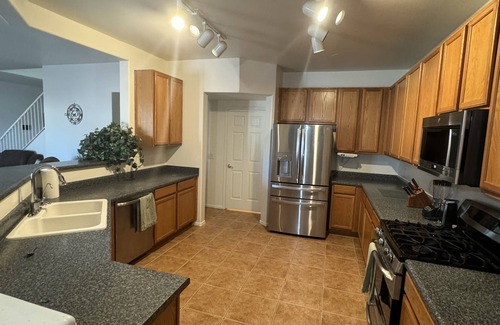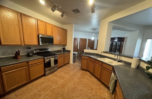 Beautiful home, sleeps 12 with 2 master suites! Sparkling Swimming pool with rock waterfall and separate therapeutic spa, private lot backed up to open area with stunning views of Arizona sunsets in the evenings and fire pit, covered porch, & outdoor patio . Spacious living room with a piano for those who love to play. More space than you need! Large private master bedroom suite with a California King Bed plus large private bedroom and bathroom suite on the first floor with walk in luxury shower in addition to two 3 guest bedrooms! Large open living room on the first floor , kitchen and dining area . Very spacious living room/loft on the 2nd floor with bunk bed perfect for children. It is also a game room including tv, foosball, and ping pong table . Located within walking distance of Rancho Del Lago's award winning Golf Course, 5 mins to I-10 for an easy commute to gem show and Tucson. in a safe and quiet neighborhood close to Amazon, Tech Park, Sonoita Wineries, Colossal Cave, Saguaro National Park East, parks, and lots of hiking trails around the area. Truly your home away from home!
