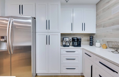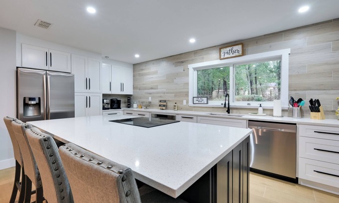 KITCHEN: Fridge, stove, oven, dishwasher, microwave, cooking basics, spices, toaster, blender, coffee maker, island w/ seating, dishware/flatware, paper towels/trash bags