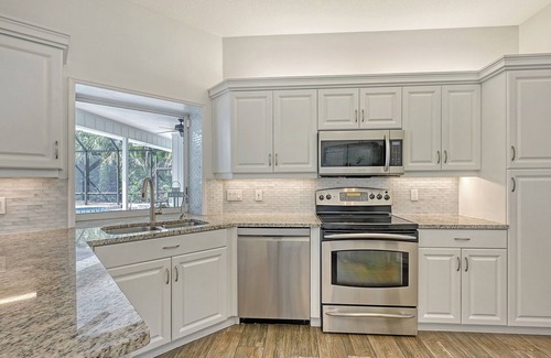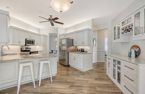 Welcome to our light-flooded Villa “Casa Felicia”. It is a beautifully furnished seasonal vacation rental with 3 BR and 2BA. The Villa is located close to the Beaches from Nokomis and worlds famous Siesta Key, grocery stores and restaurants. The master suite features a king size and ensuite bathroom with a big shower and 2 sinks. The 2nd bedroom features a queen size bed. The 3rd bedroom has a European king. The 2nd Bathroom has a shower and 1 Sink. The Kitchen is fully equipped and has a breakfast bar and a granite countertop. The pool area is accessible from the living room, the kitchen and the master bedroom. Enjoy your vacation by the covered pool area with heated (electric and solar) saltwater pool. There is a restroom and a seating area by the pool. The fenced-in backyard invites you to linger and offers a lovely seating area.