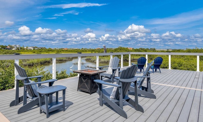 Discover your own waterfront family paradise on Anastasia Island in this newly updated and refurnished home! Sunset Dreams features a brand new large waterfront deck and pool overlooking magnificent sunsets over a tidal creek just off the intracoastal waterway. This large family home has loads of sleeping space, seven bathrooms, and is a wonderful venue to relax and take in the beauty and history of St. Augustine. Hang out with family and friends in the huge family and game room with oversized sectional, ping-pong, and game table, all overlooking the pool. This home also includes a separate second floor apartment with a king bedroom, full kitchen, bathroom, sitting room, and balcony with views to the pool and marsh, perfect for grandparents or a couple who want some privacy while traveling with the family. The beautiful new spacious deck over the creek will become your favorite oasis for hanging out with family or friends watching the sunset, enjoying the firepit under the stars, or soaking in the sun while the kids play in the pool. Fishing off the deck will likely bring in red fish, flounder, and other tidal creek favorites. Take an afternoon nap in the outdoor bed-swing, located under the shade of the porch right off the pool deck. Cook meals in the gourmet kitchen or grill out on the deck where there is also an outdoor kitchen with a wood-burning brick oven. Sunset Dreams features beautiful craftsman finishings with a blend of Spanish and modern style, enhanced with natural stone and wood accents. Furnishings are fresh and bring all the comforts of home to your vacation. You will find all you need to prepare meals at home in the fully stocked kitchen. Bedrooms are outfitted with crisp white linens, and bathrooms are supplied with soft white towels and start up bath amenities.